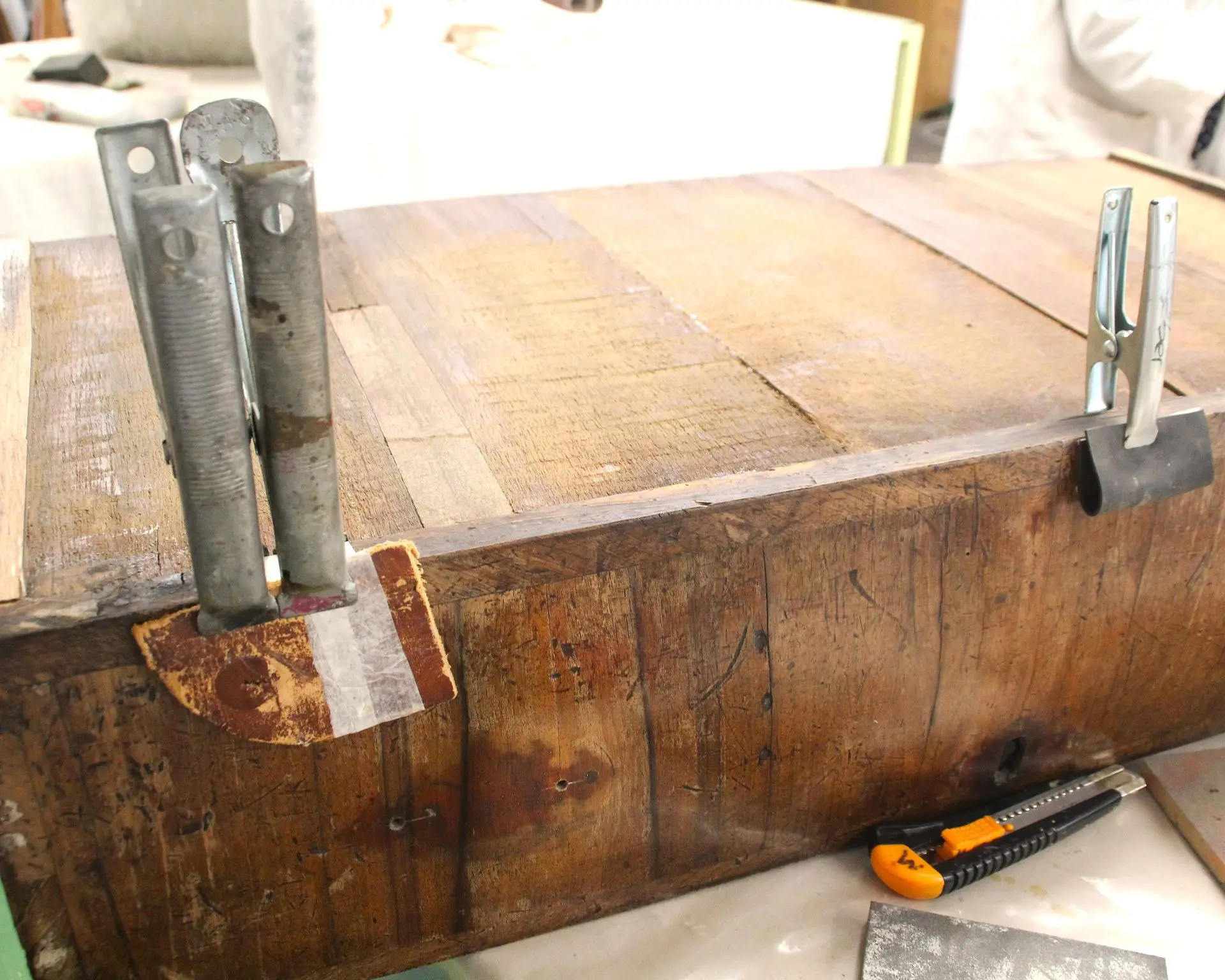 La restauración se llevó a cabo mediante un meticuloso proceso que incluyó diversas intervenciones especializadas, comenzando con la eliminación de barnices antiguos, y la reposición de las áreas donde faltaba la chapa de nogal.