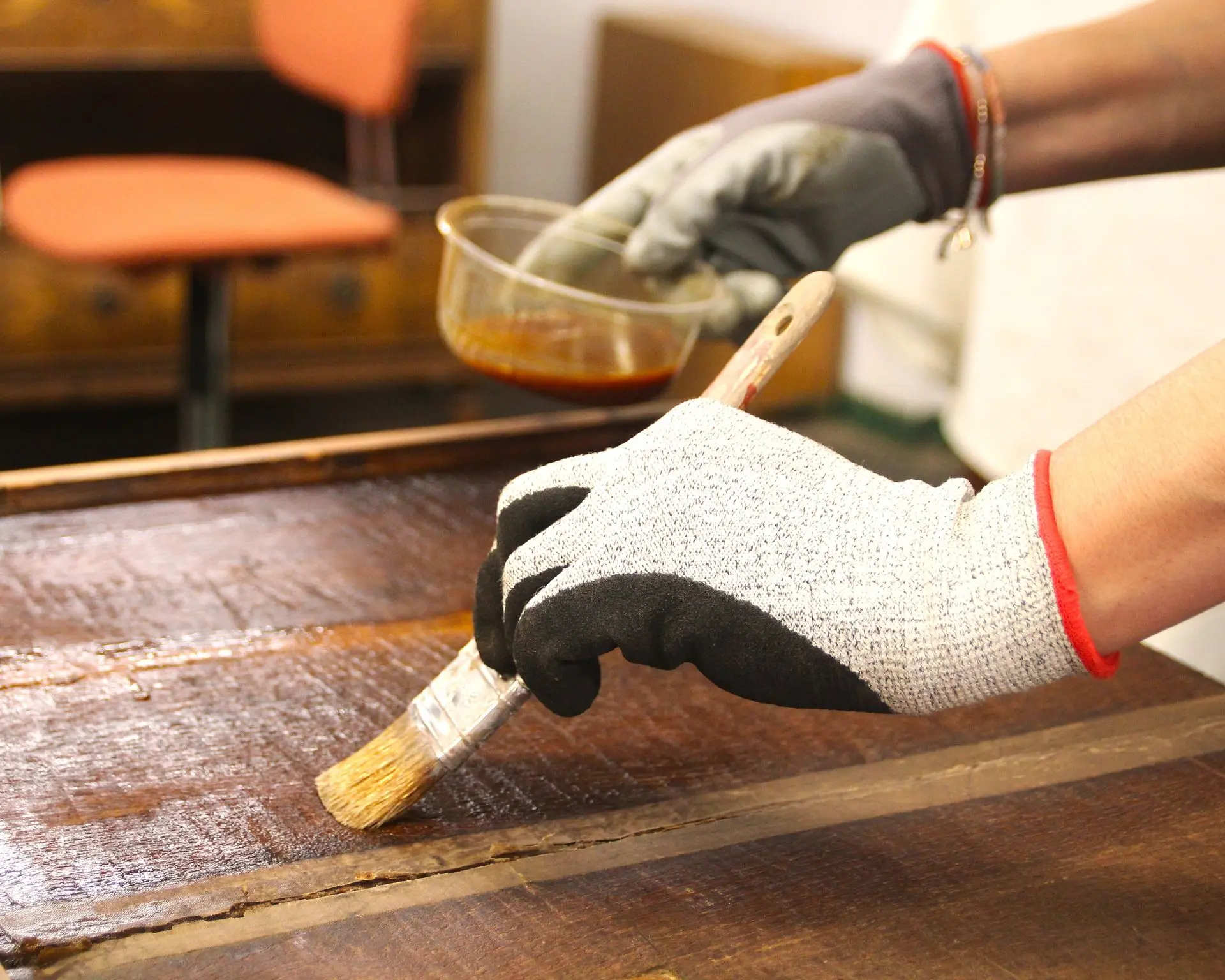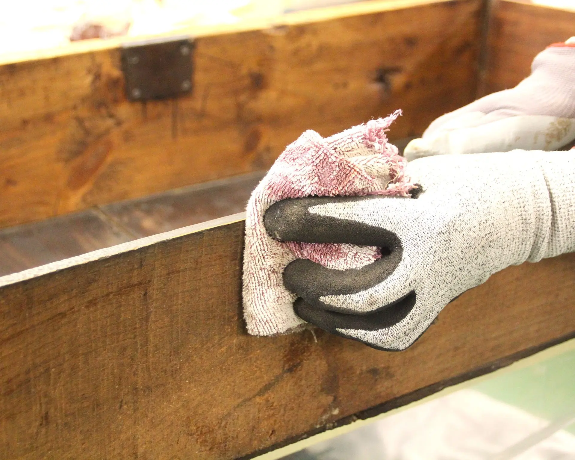 En el exterior, realizamos un cuidadoso pulido de toda la superficie de madera, seguido de una terminación de goma laca a muñequilla.