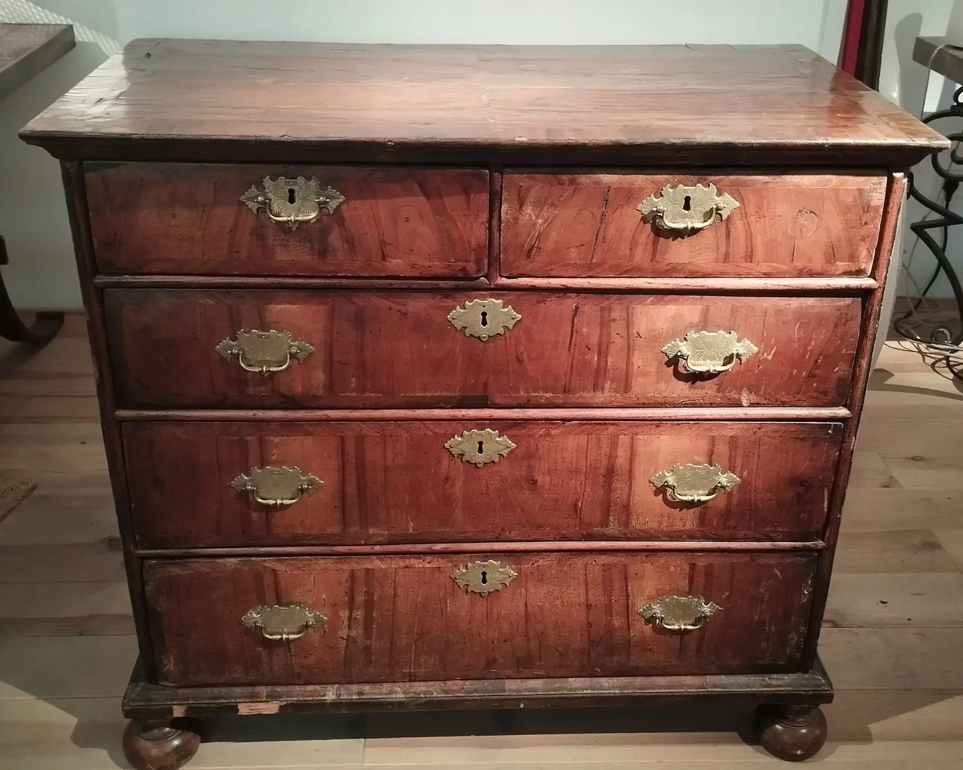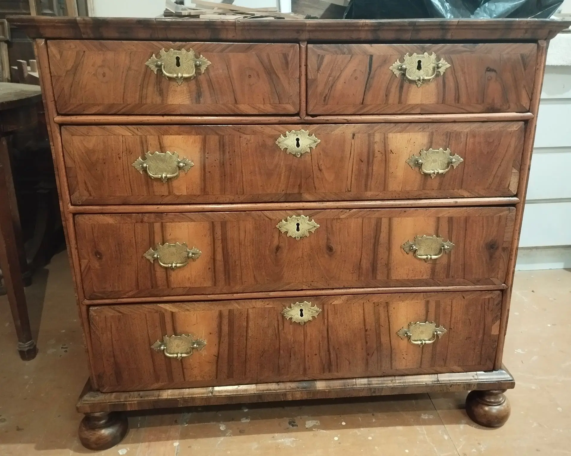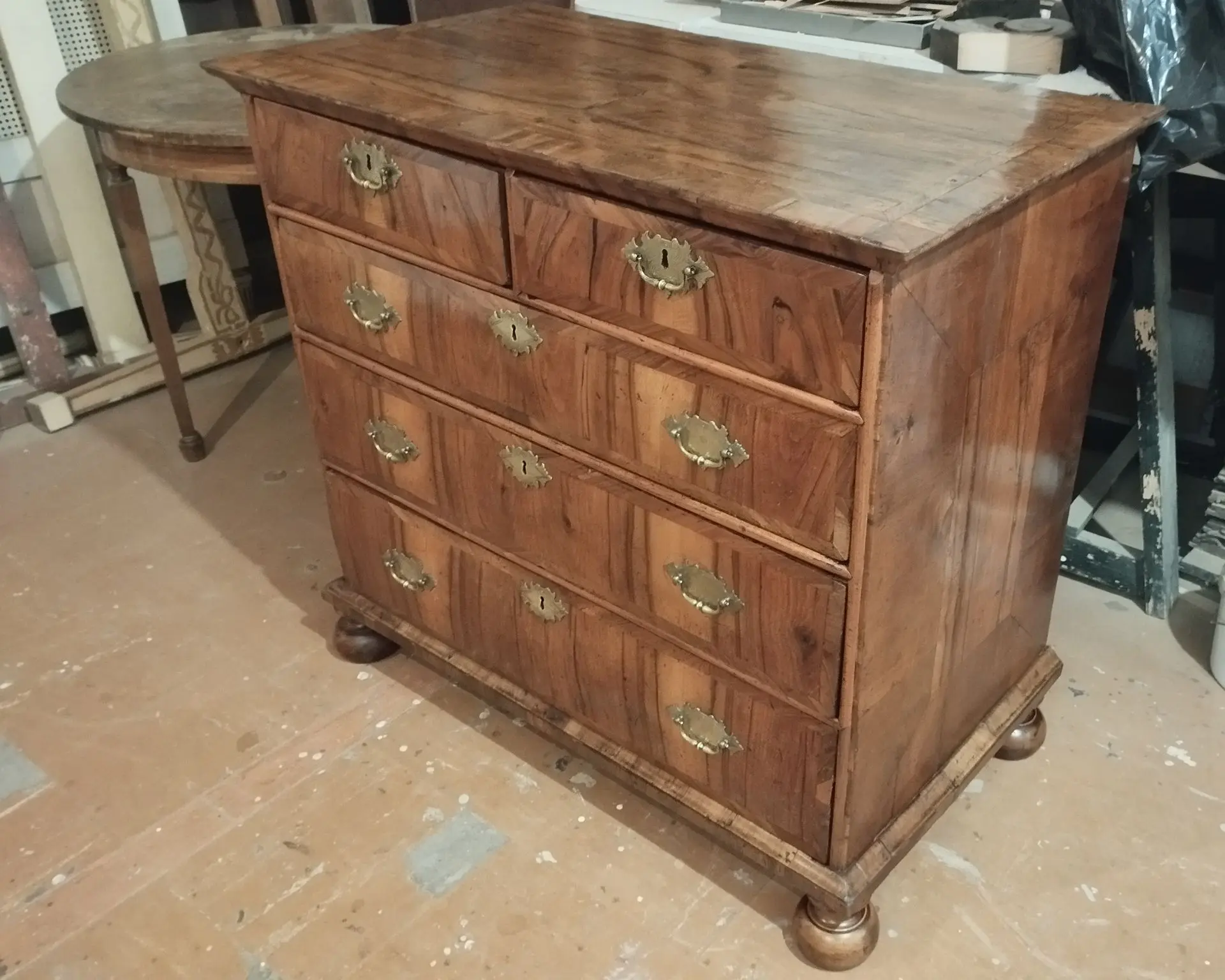 Recientemente finalizamos el trabajo de restauración de una cómoda revestida con chapa de nogal, una pieza íntegramente hecha a mano que destacaba por su valor artesanal y estético.