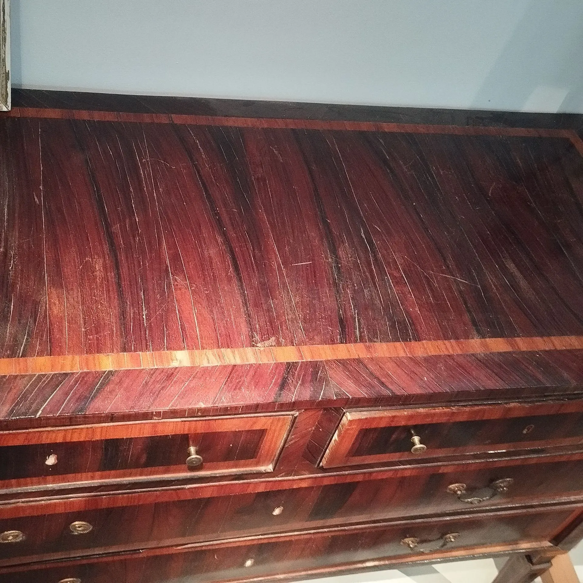 La superficie de la cómoda estaba profundamente rayada, presentaba una moldura rota y había perdido dos bocallaves de los cajones, las cuales fue necesario reproducir en palo de rosa para conservar la coherencia estética del mueble.