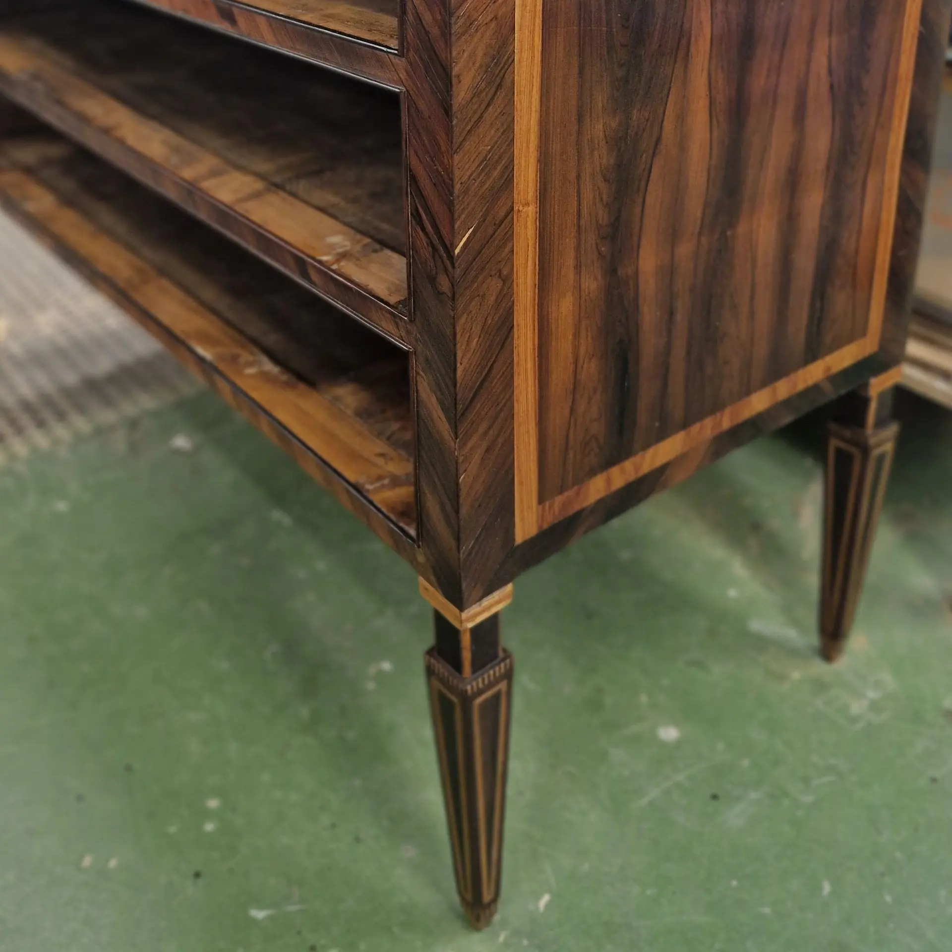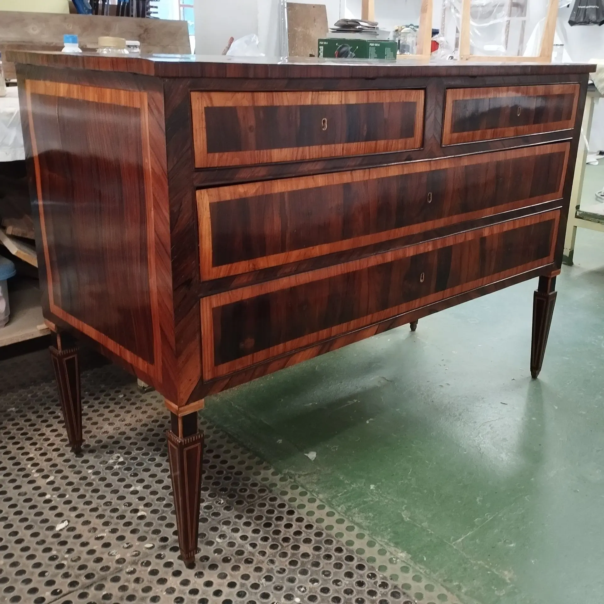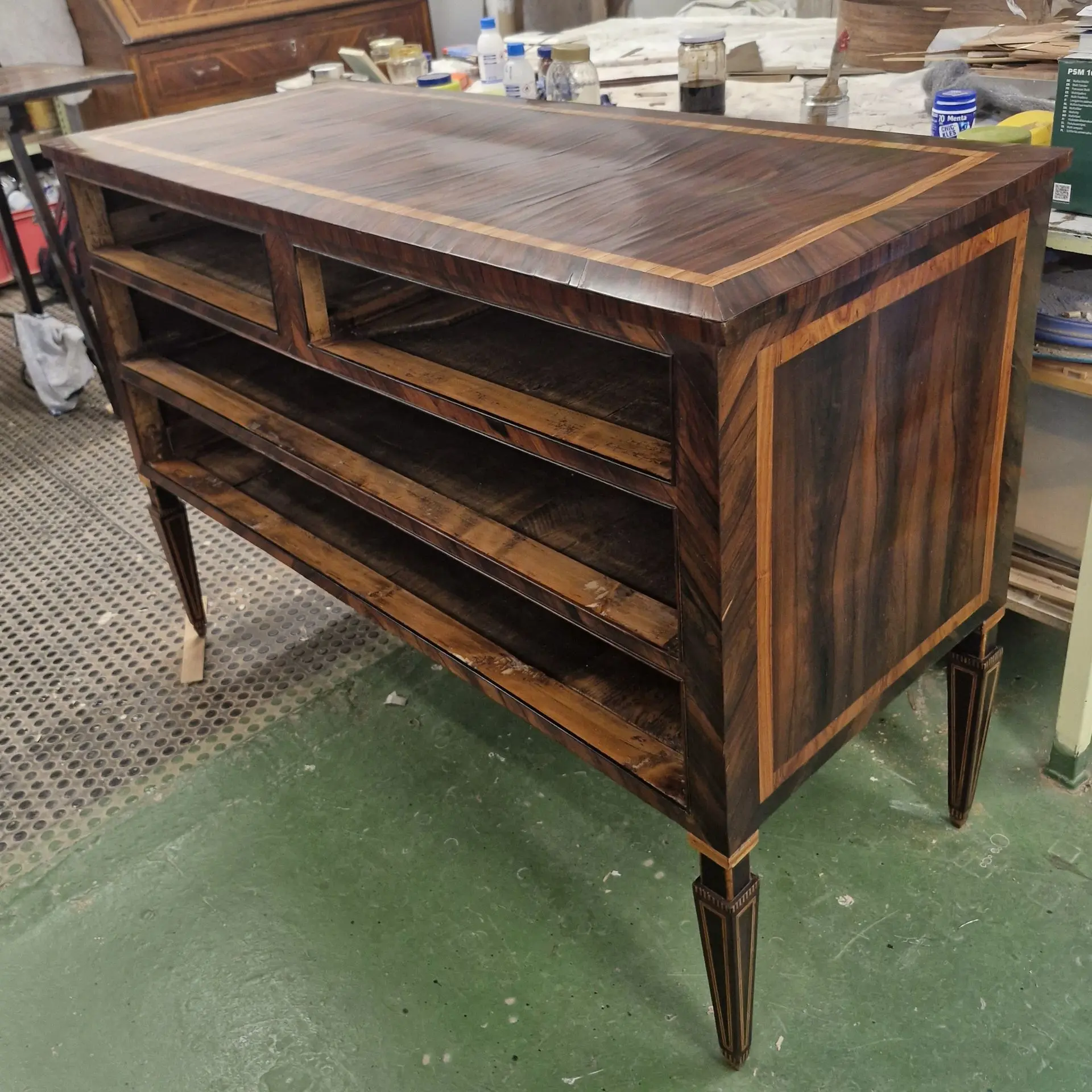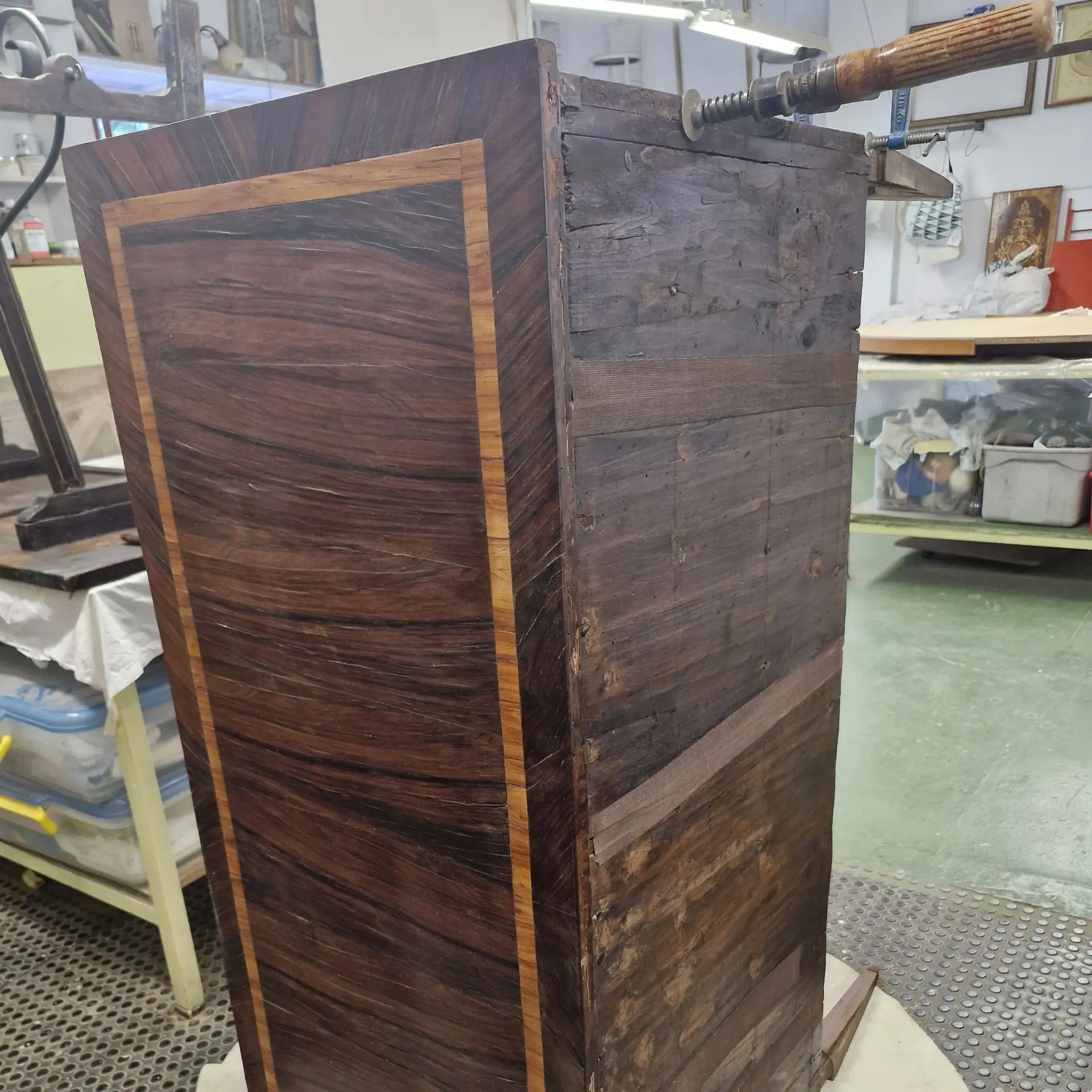 A continuación, podemos ver la restauración de una elegante cómoda elaborada en palo santo y palo de rosa, que presentaba un notable deterioro al momento de su llegada al taller.